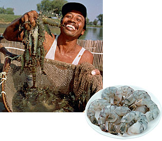 インドネシアの伝統的な養殖方法の池で、水草やプランクトンなどを食べて育ったエビ(ブラックタイガー)です。