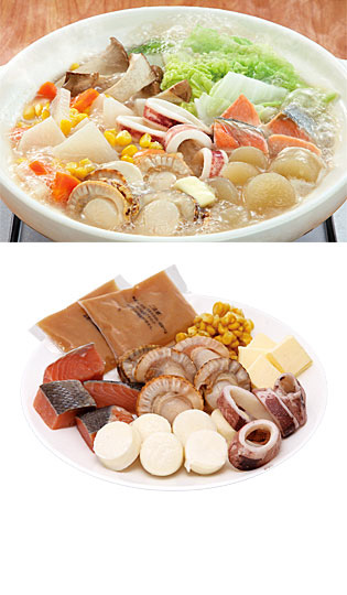 みそスープ(2袋)、バター、北海道産の鮭・ほたて貝・いか、じゃがもち、とうもろこしのセットです。