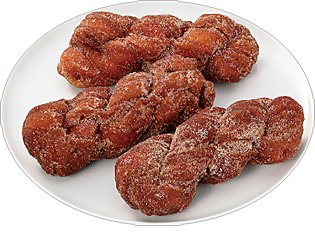 食パンに近い生地にクッキー生地を折り込み、生地をひねってサクッとした食感に揚げて、適度なバランスで混ぜ合わせたシナモンシュガーをまぶしました。