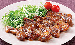 タレは、にんにく、しょうが、豆板醤入りで香味豊か。焼くと香ばしく食欲をそそります。りんごジュースも加え、味わい深いおいしさです。りんごに含まれるリンゴ酸には肉をやわらかくする効果もあります。