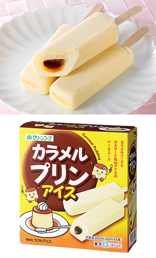 グリーンコープの産直のたまご、水あめ、グラニュー糖、加糖練乳などを使ったカスタード風味のアイスの中に、とろっとしたカラメルソースを入れたラクトアイスです。空気を混ぜ込んで食感を軽くする工程を経ず、まったりとした口あたりに仕上げました。