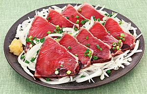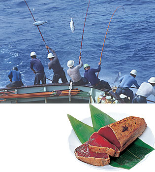 鹿児島県の枕崎港には、遠洋で一本釣りした新鮮なかつおが水揚げされます。