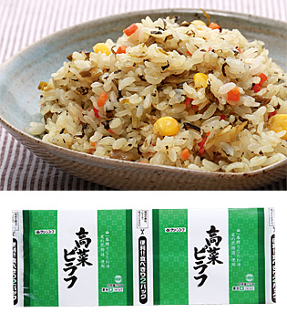フライパンを充分に熱し、油(なたね油・バター・マーガリンなどお好みで)をひき、凍ったままの高菜ピラフを入れ、中火で約3~4分間炒めてください。