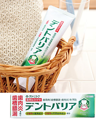 薬用はみがきデントバリアは、歯肉炎や歯周炎などの歯周病予防と虫歯予防、口臭予防、口腔内洗浄に効果のある薬用歯みがきです。