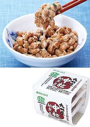 九州産中粒納豆。それまでのグリーンコープの納豆は北海道産のアキタ大豆を使っていましたが、九州産のフクユタカ(中粒)に変更。原料大豆の産地から品種、粒形までグリーンコープが指定した産直商品です。