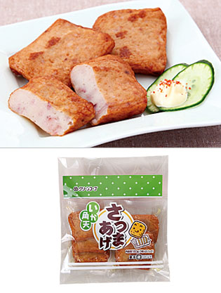 さつまあげ(いか角天)は、スケソウダラ、イトヨリなどの白身魚と地魚のトビウオで作ったすり身に九州産のマツイカ(スルメイカ)のミンチをたっぷり加えて作りました。味付けはシンプルに、ほどよい甘さに仕上げています。