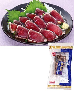 夏の終わりから秋にかけて三陸沖で漁獲した脂ののった戻りかつおを、船上で急速冷凍。