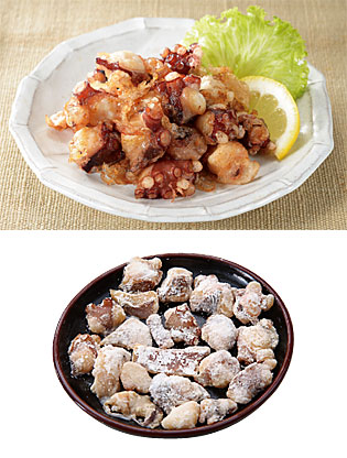 国産の真だこを使用し、しょうゆ、砂糖、清酒、しょうがで下味をつけしました。片栗粉をまぶして冷凍しています。そのままフライパンでじっくり焼くだけで、カラッとした衣と柔らかいたこが味わえます。