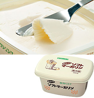 ホワイトソフトマーガリンは、主原料は国産のコメ油で、着色料を使っていない、白いマーガリンです。