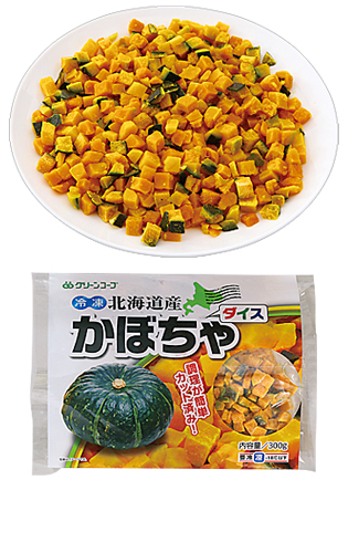 旬に収穫した北海道産のかぼちゃを約1cmのさいの目にカットして、硬めに加熱処理(ブランチング)し、急速冷凍しました。