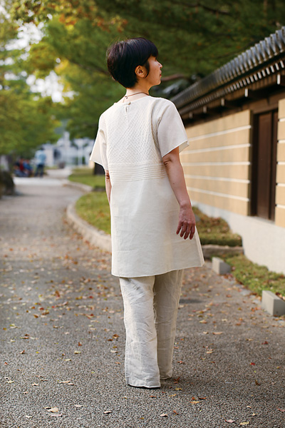 Vネックの襟はバイヤスピンタックで製作しているので、