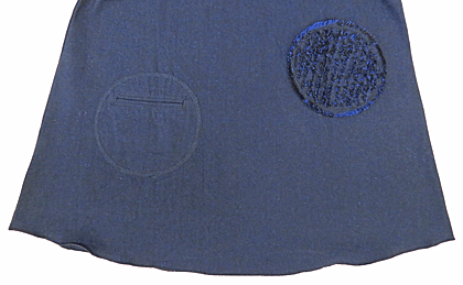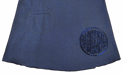 ポケットとフリンジ風の模様が、前と後ろでアシンメトリー(非対称)にあしらわれたデザイン。